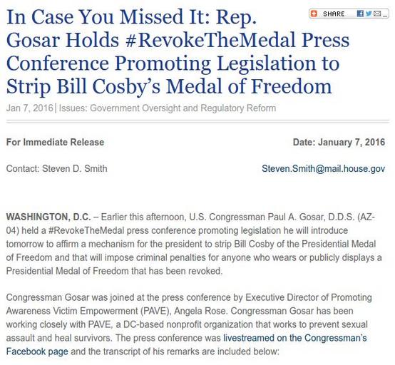 | Keywords: Rep Gosar Holds RevokeTheMedal Press Conference Promoting Legislation to Strip Bill Cosby's Medal of Freedom.jpg In Case You Missed It Rep Gosar Holds RevokeTheMedal Press Conference Promoting Legislation to Strip Bill Cosby ™s Medal of Freedom Jan 7 2016 Issues Government Oversight and Regulatory Reform For Immediate Release Date January 7 2016 Contact Steven D Smith Steven Smith mail house gov WASHINGTON D C “ Earlier this afternoon U S Congressman Paul A Gosar D D S AZ-04 held a RevokeTheMedal press conference promoting legislation he will introduce tomorrow to affirm a mechanism for the president to strip Bill Cosby of the Presidential Medal of Freedom and that will impose criminal penalties for anyone who wears or publicly displays a Presidential Medal of Freedom that has been revoked Congressman Gosar was joined at the press conference by Executive Director of Promoting Awareness Victim Empowerment PAVE Angela Rose Congressman Gosar has been working closely with PAVE a DC-based nonprofit organization that works to prevent sexual assault and heal survivors The press conference was livestreamed on the Congressman ™s Facebook page and the transcript of his remarks are included below 3 00 P M EST - WASHINGTON D C CONGRESSMAN PAUL GOSAR Good afternoon and thank you all for joining us today for this important press conference My name is Paul Gosar and I represent Arizona ™s 4th Congressional district As a member of the House Committee on Oversight and Government reform my colleagues and I have made it our mission to hold the government accountable for its actions From time to time such as this it includes oversight of accolades awarded by the government The Presidential Medal of Freedom was established in 1963 This prestigious award is bestowed on recipients for especially meritorious contributions to the security or national interests of the United States to world peace or to cultural or other significant public or private endeavors The Medal of Freedom is the highest level of honor our country gives to civilians and it is the responsibility of Congress to ensure proper accountability and preserve the integrity of the award William Henry Bill Cosby Jr received the Presidential Medal of Freedom in 2002 Sadly over the past year we have learned from Cosby ™s own admissions that he acted in ways unbecoming of a recipient of the Medal of Freedom Cosby ™s shocking admission in a 2005 deposition where he admitted to drugging women in order to satisfy his sexual desires make him unfit to retain our nation ™s highest civilian honor Court documents obtained by the Associated Press on Monday July 7 2015 revealed that ¦ quoting the New York Daily News ¦ Cosby admitted under oath that he bought Quaaludes to dope the women he wanted to grope ”and slipped the sedative to at least one lady and ˜other people ™ end quote Specifically during the September 29 2005 deposition a lawyer Dolores Troiani asked Cosby quote When you got the Quaaludes was it in your mind that you were going to use these Quaaludes for young women that you wanted to have sex with and Cosby answered Yes end quote To continue honoring Bill Cosby with this prestigious accolade would be an affront to women nationwide particularly those who were victims of his horrific acts Last July when questioned about revoking Cosby ™s medal President Obama stated There's no precedent for revoking a medal ¦We don't have that mechanism Since that time I have been working closely with PAVE and others to craft legislation that provides a mechanism Tomorrow several of my colleagues and I will introduce legislation that ensures there is a mechanism in place to strip Cosby or anyone else found dishonorable of the Medal of Freedom Our legislation imposes criminal penalties for anyone who wears or publicly displays a Presidential Medal of Freedom that has been revoked Now I want to be very clear about one thing It is true that there is a presumption of innocence in the American legal system and rightly so And while our criminal justice system will ultimately determine whether Cosby serves jail time for any of the crimes of which he has been accused Cosby ™s own admissions to drugging women in order to satisfy his sexual desires place him outside the bounds of whom we should admire in our society As one of my constituents Dennis Luis stated eloquently on my Facebook page Civilian honors such as this come with no legal protections or guarantees Honors are optional and not anyone's legal right to have and keep ¦The bar should be extraordinarily high for the Medal of Freedom and to keep Cosby as a recipient greatly diminishes the very worth of that honor Furthermore by allowing Cosby to keep his Medal of Freedom our nation is sending the wrong message to society and future generations And like so many Americans I am sick and tired of watching the rapid decline of our culture right in front of our eyes It is time to reclaim our nation ™s moral compass The Presidential Medal of Freedom is an important symbol of our country It is time for our elected leaders to boldly take a stand for what is right and join together in condemning abhorrent behavior like that of Bill Cosby Revoking Bill Cosby ™s Medal of Freedom won ™t undo his actions or heal the wounds of his victims but it will signal to the American people that we will not tolerate such lewd behavior I am honored to be joined today by Angela Rose Executive Director of PAVE which stands for Promoting Awareness Victim Empowerment PAVE is a national nonprofit organization that does great work in seeking to prevent sexual assault and assist with healing survivors Angela the floors all yours Background The full text of the draft Gosar legislation can be found HERE PAVE ™s press release from 12/17/15 can be found HERE Congressman Gosar has been working on this legislation for months following the release of the 2005 deposition in July 2015 Last July when questioned about 