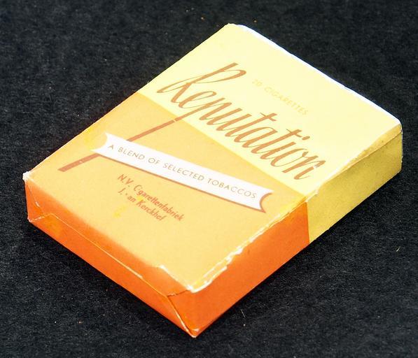 Keywords: Reputation cigarettes pack, foto1.JPG Very old Dutch product that is not produced and/or not sold any more own 2014-04-13 11 32 32 Alf van Beem CC-Zero Trademarked Reputation cigarettes Cigarette packs