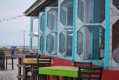 Keywords: restaurant outdoors windows dining lifestyle dinner vacation alcohol sitting tables chairs beach summer leisure together ocean tourism
