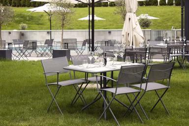Keywords: restaurant table chairs grass lunch setting catering umbrella outdoors furniture patio