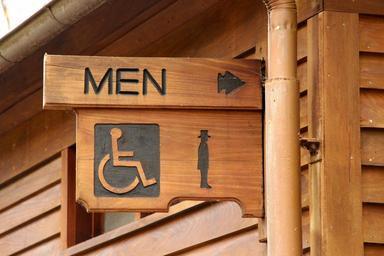 Keywords: restroom public convenience wooden sign men point facility