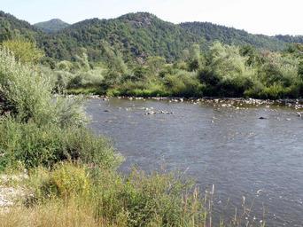 | Keywords: Retournac Côtes de Saint-Ignac.JPG Retournac dép de la Haute-Loire France Auvergne La Loire au nord-est de Retournac en amont du pont ferroviaire près du hameau de Chambonnet Les hauteurs boisées et rocheuses au second plan sont les côtes de Saint-Ignac La Loire qui coule ici de droite à gauche fait ensuite un virage à droite et passe au pied des côtes de Saint-Ignac Le sommet dans le lointain à gauche est la montagne de la Madeleine Nous regardons vers le nord-est own Photo personnelle Torsade de Pointes Août 2009 Retournac Loire River in Haute-Loire |