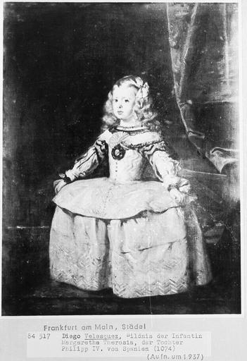 | Keywords: Retrato de la infanta Margarita, by studio of Diego Velázquez.jpg Artwork Creator Diego Velázquez de Porträt der Infantin Margerita im Alter von etwa 3 Jahren es Retrato de la infanta Margarita 1651-1673 ca 1653-1656 Oil on canvas cm 128 5 100 Stadelsches Kunstinstitut Frankfurt http //picasaweb google com/EnrikeCdC/VelazquezObraCompleta 5295182063285929170 Other versions <gallery> File Diego Velázquez 028 jpg Kunsthistorisches Museum File Diego Velázquez 028b jpg File Retrato de la infanta Margarita 2 by Diego Velázquez jpg </gallery> PD-old-100 picasareviewunnecessary DEFAULTSORT 1653-1656; Margaret Theresa of Spain Infanta Margarita Teresa by Velazquez Kunsthistorisches Museum 1656 Black and white reproductions of portrait paintings in color Replicas of paintings |
