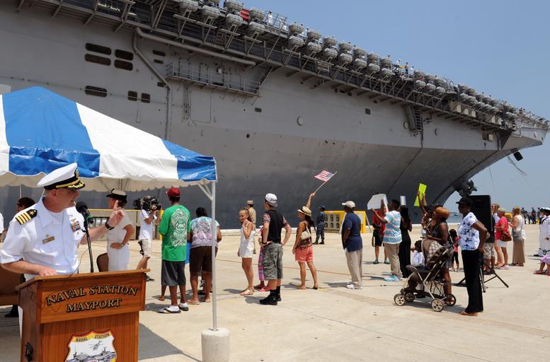 | Keywords: Return to port 140817-N-TC587-104.jpg en Capt Wes McCall commanding officer Naval Station Mayport delivers remarks during a homeport change ceremony for the amphibious dock landing ship USS Fort McHenry LSD 43 and the amphibious assault ship USS Iwo Jima LHD 7 at Naval Station Mayport The homeport change is part of the Iwo Jima Amphibious Ready Group homeport change in support of strategic dispersal and two viable East Coast surface ship homeports as well as the preservation of the ship repair industrial base in those areas U S Navy photo by Mass Communication Specialist 2nd Class Damian Berg/Released 2014-08-17 Petty Officer 3rd Class Damian Berg https //www dvidshub net/image/1517373 140817-N-TC587-104 2014-08-22 01 12 MAYPORT FL US PD-USGov-Military-Navy Naval Station Mayport USS Iwo Jima LHD-7 USS Fort McHenry LSD-43 Images from US Navy location Iwo Jima Japan Images from DoD uploaded by Fæ |