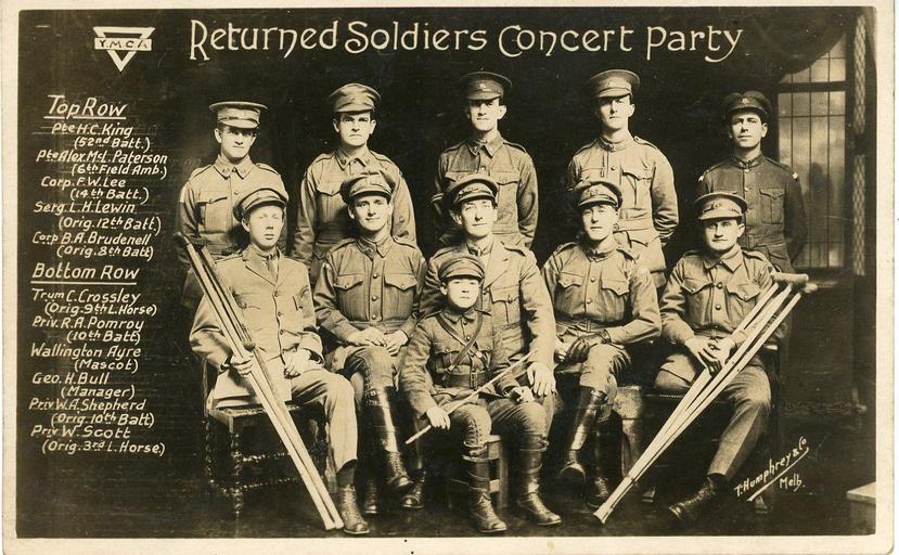 | Keywords: ymca ww1 concert party soldiers australia photo border monochrome Published in the Maryborough and Dunolly Advertiser - Wednesday 14 November 1917. Y.M.C.A. RETURNED SOLDIERS' CONCERT PARTY. UNIQUE ENTERTAINMENT. Mr. W. J. Richards, advance manager of the talented combination of returned soldiers who are touring Australia to raise funds for the war work of that magnificent institution; the Y.M.C.A, has arranged for the party to appear in the town hall next Monday night. This concert party, which started to tour Victoria about eight weeks ago, has had an unparallelled run of success. It appeared in the Princess Theatre in Bendigo last week, when as a result of the evening's effort £312 was raised. The party also appeared in the Melbourne Town Hall before a thronged audience, over which His Excellency the Governor of Victoria (Sir Arthur Stanley) presided. They are all returned soldiers, with the exception of the Bendigo "Boy Wonder," Wallington Ayre, twelve years of age, the regimental pet, and mascot. He has a brother in France, and has another in camp, and he too is doing his bit with the concert party. The other members of the party are: -Mr. G eo. H. Bull of Adelaide, as manager and organiser. He has managed similar parties in South Australia, where he has raised £11,000 for Y.M.C.A. work. Private W. A. Shepherd, of the original 10th Batt, who left Australia in October 1914. He served at Anzac, and was wounded in the left arm at Lone Pine, after which he was invalided to Malta, and returned to Australia in August, 1916. He previously served with the Middlesex Regiment, England. Private R. A. Pomroy, secretary of the party, was also attached to the 10th Batt, and left Australia in June 1915. He served at Anzac and was invalided to Egypt, having sustained shell shock, and subsequently enteric fever, and returned to Australia in May, 1916. Private H. C. King was a member of the 52nd Batt, and left Australia in October, 1915. After serving at Suez Canal, he went to France, and took part in the engagements at Fleur Bais, Mouquet Farm, and Pozieres. He Was wounded in September 1916. Private Alex. M.L. Paterson. of the 6th Field Ambulance, left Australia in May 1915, but was invalided home in July, 1916, He served at Anzac for two months. Corporal B. A. Brudenell belonged to the original 8th Batt and left Australia in October 1914. He was wounded at Gallipoli. and had his left leg amputated at Malta. He returned to Australia in May 1916. Sergeant L. H. Lewin, who is a card manipiulator and conjuror, was attached to the 12th Batt which left Australia in October 1914. He was blown up at Lone Pine and had an attack of enteric fever. He was invalided to England, where he recovered and was drafted to France. He, however, returned to England, suffering from pneumonia and pleurisy, and returned to Australia in July 1917. Private W. Scott, of the original 3rd Light Horse, left Australia in October 1914. He served on the peninsula, and lost his right leg in July 1915, returning to Australia in February 1916. He had previously had six years' military experience with the 7th Dragoon Guards, England. Trumpeter C. Crossley attached to the original Light Horse, left Australia in February 1915. From Gallipoli he was invalided to Egypt with a crushed foot. He went to Palestine in February 1916, and lost his right leg in February 1917, returning to Australia some time later. Trumpeter Crossley of Boy Scouts who came out to form the Boy Scout movement in Australia. On the outbreak of war he enlisted as a trumpeter. He is only nineteen years of age. He plays the cornet, and swings swords. Residents of Maryborough may look forward to an evening's enjoyment possessing novelty and merit, and a crowded house is anticipated. Patrons are therefore advised to book their seats early. trove.nla.gov.au/ndp/del/article/90588249?searchTerm=ymca... (found on ebay) Another photo of this group at the Australian War Memorial: www.awm.gov.au/collection/P05335.001 Published in the Maryborough and Dunolly Advertiser - Wednesday 14 November 1917. Y.M.C.A. RETURNED SOLDIERS' CONCERT PARTY. UNIQUE ENTERTAINMENT. Mr. W. J. Richards, advance manager of the talented combination of returned soldiers who are touring Australia to raise funds for the war work of that magnificent institution; the Y.M.C.A, has arranged for the party to appear in the town hall next Monday night. This concert party, which started to tour Victoria about eight weeks ago, has had an unparallelled run of success. It appeared in the Princess Theatre in Bendigo last week, when as a result of the evening's effort £312 was raised. The party also appeared in the Melbourne Town Hall before a thronged audience, over which His Excellency the Governor of Victoria (Sir Arthur Stanley) presided. They are all returned soldiers, with the exception of the Bendigo "Boy Wonder," Wallington Ayre, twelve years of age, the regimental pet, and mascot. He has a brother in France, and has another in camp, and he too is doing his bit with the concert party. The other members of the party are: -Mr. G eo. H. Bull of Adelaide, as manager and organiser. He has managed similar parties in South Australia, where he has raised £11,000 for Y.M.C.A. work. Private W. A. Shepherd, of the original 10th Batt, who left Australia in October 1914. He served at Anzac, and was wounded in the left arm at Lone Pine, after which he was invalided to Malta, and returned to Australia in August, 1916. He previously served with the Middlesex Regiment, England. Private R. A. Pomroy, secretary of the party, was also attached to the 10th Batt, and left Australia in June 1915. He served at Anzac and was invalided to Egypt, having sustained shell shock, and subsequently enteric fever, and returned to Australia in May, 1916. Private H. C. King was a member of the 52nd Batt, and left Australia in October, 1915. After serving at Suez Canal, he went to France, and took part in the engagements at Fleur Bai