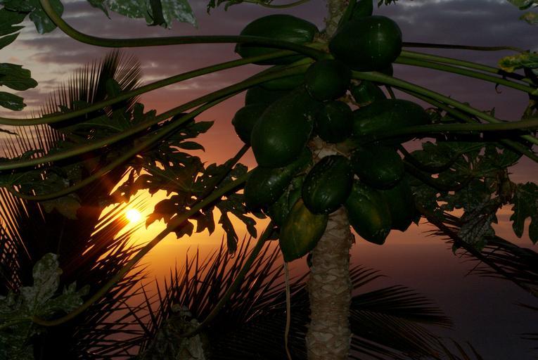 Keywords: reunion island sunset evening inflamed sun ocean sea sky side leaves holiday silhouette summer nature yellow orange light papaya