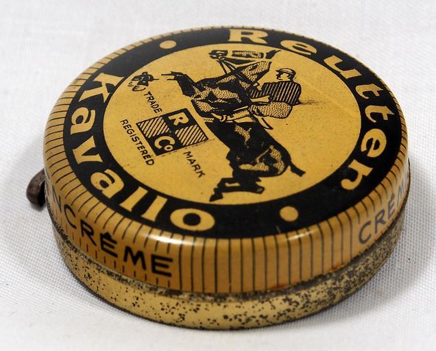 Keywords: Reutter Kavallo Horse Shoe Polish Tin 1930s picture 2.JPG Very old packaging of a Dutch product that is not produced and not sold any more Photographed at a collector of Droste For info see http //www tincollectors nl/ tincollectors nl or email info tincollectors nl own 2014-06-15 11 19 40 Alf van Beem CC-Zero Trademarked Shoe polish tins |