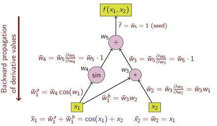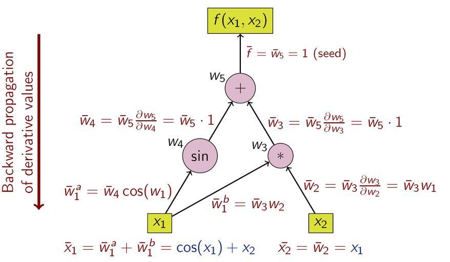 | Keywords: ReverseaccumulationAD.png  I made this myself using the graphics programming language en TikZ en Beamer LaTeX and en LaTeX It displays how derivative values propagate according to the chain rule in en automatic differentiation for the function <math>f x_1 x_2 x_1 x_2 + \sin x_1 </math> The only seed possible is <math>\bar f 1</math> which yields the complete gradient of <math>f x_1 x_2 </math> <math>\partial f/\partial x_1 x_2 + \cos x_1 </math> which comes out of the <math>x_1</math> node and <math>\partial f/\partial x_2 x_1</math> which comes out of the <math>x_2</math> node en wikipedia JRGomà 2007-01-18 Berland wikipedia en math Berland original upload log page en wikipedia ReverseaccumulationAD png 2007-01-18 22 14 Berland 1319×769× 70733 bytes <nowiki>I made this myself using the graphics programming language TikZ Beamer LaTeX and LaTeX </nowiki> Differential calculus TikZ diagrams |