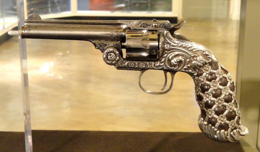 Keywords: Revolver, .38 caliber Single Action Third Model, c. 1892, Smith & Wesson, decorated by Tiffany Jewelers for Columbian Exposition, steel and silver - Lyman & Merrie Wood Museum of Springfield History - DSC04183.JPG en Exhibit in the Lyman Merrie Wood Museum of Springfield History Springfield Massachusetts USA This exhibit is old enough so that it is in the public domain Photography was permitted in the museum without restriction 2012-12-19 15 40 46 own Daderot cc-zero Revolvers in the Lyman Merrie Wood Museum of Springfield History Uploaded with UploadWizard Smith Wesson revolvers Tiffany Co Items displayed at the World's Columbian Exposition 1893 Tiffany silver |
