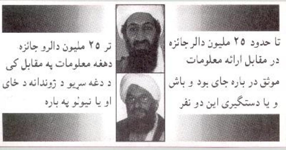 | Keywords: Reward for Osama bin Laden, Ayman al Zawahiri -- AFD290B.jpg AFD290 FRONT UP TO 25 000 REWARD AIMAN AL-ZAWAHIRI OSAMA BIN LADEN BACK UP TO 25 000 000 REWARD FOR INFORMATION LEADING TO THE WHEREABOUTS OR CAPTURE OF THESE TWO MEN U S Defense Secretary Donald Rumsfeld told reporters on November 19 2001 that leaflets advertising a 25 million reward for information leading to the capture of Saudi-born militant Osama bin Laden and Aimen al Zawahiri bin Laden's top lieutenant were dropping like snowflakes in December in Chicago from U S military aircraft This Department of Defense photograph shows an example of the leaflet http //www psywarrior com/afghanleaf06 html unknown CIA PD-USGov Taliban leaflet Wanted notices |