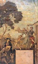Keywords: Rex Whistler - Rural Scene with Putto Conducting Two Men and Figures Dancing 1925.jpg oil canvas 331 x 199 cm http //www bbc co uk/arts/yourpaintings/paintings/search/painted_by/rex-whistler PD-old-70 Rex Whistler 1925 paintings