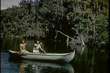 | Keywords: florida wakulla springs wakullasprings rey and jerry wood reyandjerrywood canoeing swimming diving newt perry newtperry paddling Persistent URL: www.floridamemory.com/items/show/296312 Title: Rey and Jerry Wood Canoeing the Wakulla River Date of film: ca. 1940 Physical descrip: 6:20; color; silent Local call number: V-259; BA436 General note: This film shows a couple paddling what appears to be a homemade boat or canoe. According to the film’s intertitles, the couple is Rey and Jerry Wood, “two youthful adventurers paddling their way from California to New York City.” The film shows the pair paddling through the “scenic jungle” of the Wakulla River and into Wakulla Springs. Promoter and expert swimmer Newt Perry dives from a high platform into the spring. He swims to the boat and invites Jerry to take a dip. Jerry removes his pants to reveal a bathing suit and dives in. Newt Perry offers Jerry his diving mask, and they take turns going under water until Jerry returns to the boat, giving thanks and waving goodbye. Rey and Jerry paddle back onto the river and through lush, tree-canopied areas. Jerry smokes his pipe as they paddle through swampy grasses. The last intertitle reads, “They reluctantly paddle down the river to the gulf and more adventure carrying with them plenty of material for a chapter on the Wakulla Springs in their new book.” To see full-length versions of this and other videos from the State Archives of Florida, visit www.floridamemory.com/video/. Repository: State Library and Archives of Florida, 500 S. Bronough St., Tallahassee, FL 32399-0250 USA. Contact: 850.245.6700. Archives@dos.myflorida.com Persistent URL: www.floridamemory.com/items/show/296312 Title: Rey and Jerry Wood Canoeing the Wakulla River Date of film: ca. 1940 Physical descrip: 6:20; color; silent Local call number: V-259; BA436 General note: This film shows a couple paddling what appears to be a homemade boat or canoe. According to the film’s intertitles, the couple is Rey and Jerry Wood, “two youthful adventurers paddling their way from California to New York City.” The film shows the pair paddling through the “scenic jungle” of the Wakulla River and into Wakulla Springs. Promoter and expert swimmer Newt Perry dives from a high platform into the spring. He swims to the boat and invites Jerry to take a dip. Jerry removes his pants to reveal a bathing suit and dives in. Newt Perry offers Jerry his diving mask, and they take turns going under water until Jerry returns to the boat, giving thanks and waving goodbye. Rey and Jerry paddle back onto the river and through lush, tree-canopied areas. Jerry smokes his pipe as they paddle through swampy grasses. The last intertitle reads, “They reluctantly paddle down the river to the gulf and more adventure carrying with them plenty of material for a chapter on the Wakulla Springs in their new book.” To see full-length versions of this and other videos from the State Archives of Florida, visit www.floridamemory.com/video/. Repository: State Library and Archives of Florida, 500 S. Bronough St., Tallahassee, FL 32399-0250 USA. Contact: 850.245.6700. Archives@dos.myflorida.com |