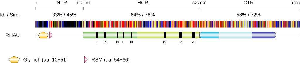| Keywords: RHAU domain architecture 02.svg en Structure and organization of RHAU The helicase enzymatic core region of RHAU consists of two RecA domains green and a helicase associated region blue The amino terminal part include the RSM domain and a low-complexity Gly-rich domain own Glongtarin 2010-06-01 cc-zero Check categories 2010 August 11 en wikipedia RHAU 2 RNA Hydrolases |