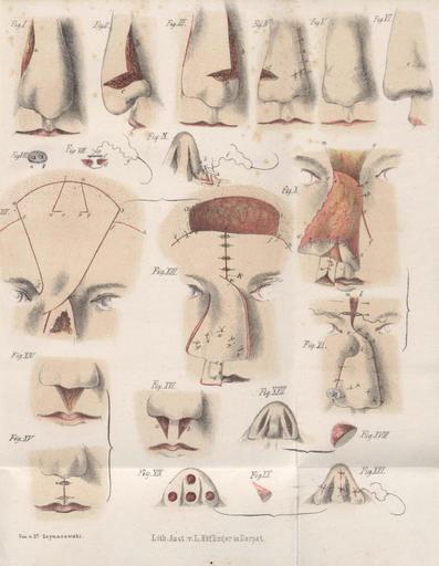 | Keywords: Rhinoplasticen.JPG en Plate drawn by Julius von Szymanowski on reconstructive rhinoplasty Szymanowski Adnotationes ad rhinoplasticen typ viduæ J C Schünmanni et C Mattieseni Dorpati Liv 1857 Julius von Szymanowski died 1868 1857 PD due to its age PD-old Julius von Szymanowski |