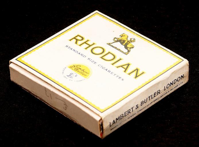 Keywords: Rhodian cigarettes pack, pic3.JPG Very old packaging of a product that is not produced and not sold any more own 2014-04-13 11 12 34 Alf van Beem CC-Zero Trademarked Rhodian cigarettes Cigarette packs