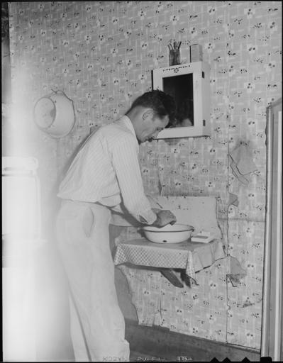 | Keywords: Richard Hughes, a miner, washes his hands in the kitchen of his four room house for which he pays $9 monthly. Panther... - NARA - 540996.jpg Scope and content General notes 540996 Local identifier 245-MS-1930L Department of the Interior Solid Fuels Administration For War 04/19/1943 - 06/30/1947 NARA-Author Lee Russell 1903-1986 Photographer 2489414 <br /> Still Picture Records Section Special Media Archives Services Division NWCS-S National Archives at College Park 8601 Adelphi Road College Park MD 20740-6001 1946-08-26 Record group Record Group 245 Records of the Solid Fuels Administration for War 1937 - 1948 Record group ARC 572 Photographs of the Medical Survey of the Bituminous Coal Industry compiled 1946 - 1947 Series ARC 540230 File unit File unit ARC Variant control numbers NAIL Control Number NWDNS-245-MS-1930L Other versions <gallery> File Richard_Hughes _a_miner _washes_his_hands_in_the_kitchen_of_his_four_room_house_for_which_he_pays_ 9_monthly _Panther _-_NARA_-_540996 tif tif File Richard_Hughes _a_miner _washes_his_hands_in_the_kitchen_of_his_four_room_house_for_which_he_pays_ 9_monthly _Panther _-_NARA_-_540996 jpg jpg </gallery> NARA-cooperation PD-USGov Coal mining in the United States Hand washing |
