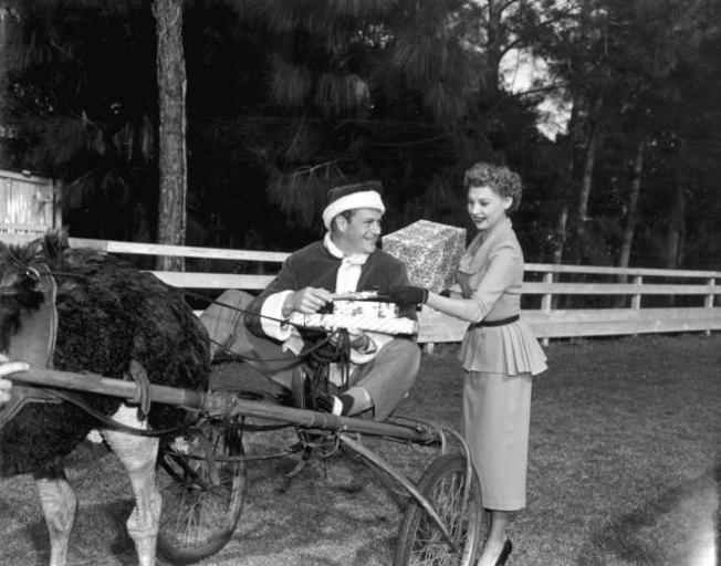 Keywords: florida ostriches richard webb richardwebb mari aldon marialdon distant drums distantdrums santa claus santaclaus christmas gifts christmasgifts carriages carts saint johns county saintjohnscounty saint augustine saintaugustine costumes premieres fences motion pictures motionpictures movie stars moviestars actors actresses state library and archives of florida statelibraryandarchivesofflorida christmas across the commons christmasacrossthecommons christmas 1951 christmas1951 blackandwhite monochrome outdoor black and white Local call number: c015684 Title: [Richard Webb on an ostrich-drawn cart and Mari Aldon hold gifts during "Distant Drums" premiere: Saint Augustine, Florida] Date: Photographed in December 1951. Physical descrip: 1 photoprint : b&w ; 4 x 5 in. Series Title: (Commerce Collection.) General note: "Distant Drums" (1951) was directed by Raoul Walsh, and released by Warner Brothers. It was set in the Everglades in 1840's, during the Second Seminole War. The film starred Gary Cooper. Repository: State Library and Archives of Florida, 500 S. Bronough St., Tallahassee, FL 32399-0250 USA. Contact: 850-245-6700. Archives@dos.state.fl.us Persistent URL: www.floridamemory.com/items/show/70723 Local call number: c015684 Title: [Richard Webb on an ostrich-drawn cart and Mari Aldon hold gifts during "Distant Drums" premiere: Saint Augustine, Florida] Date: Photographed in December 1951. Physical descrip: 1 photoprint : b&w ; 4 x 5 in. Series Title: (Commerce Collection.) General note: "Distant Drums" (1951) was directed by Raoul Walsh, and released by Warner Brothers. It was set in the Everglades in 1840's, during the Second Seminole War. The film starred Gary Cooper. Repository: State Library and Archives of Florida, 500 S. Bronough St., Tallahassee, FL 32399-0250 USA. Contact: 850-245-6700. Archives@dos.state.fl.us Persistent URL: www.floridamemory.com/items/show/70723 |