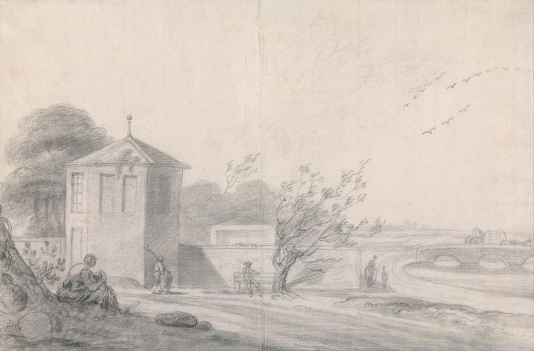 | Keywords: Richard Wilson - Riverside Scene with Figures, Hexagonal Building Left and Horse-Drawn Wagon Crossing Bridge at Right - Google Art Project.jpg No inscription Inscription _Signed_and_Dated Not signed not dated Not on View Graphite and black chalk with black ink on medium moderately textured blued white laid paper birds horses animals hexagon river wagon landscape special url_id aAGSbou17jxp7Q PD-old-100-1923 1782 Richard Wilson painter Google Art Project works by Richard Wilson | ||||