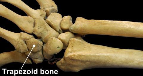 | Keywords: RightHumanPosteriorDistalRadiusUlnaCarpals - Trapezoid bone.png  Bones of human right hand with thumb on bottom Posterior surface dorsal surface Trapezoid bone labelled File RightHumanPosteriorDistalRadiusUlnaCarpals jpg 2013-11-11 Photo is by Brian C Goss No rights reserved -thumb left Original photo Trapezoid bone |