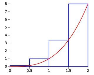 | Keywords: RightRiemann2.svg en A right Riemann sum of x 3 over 0 2 using 4 subdivisions Own Qef 2009-06-21 Shows same thing as this bitmap version file RightRiemann2 PNG Gnuplot source <pre> set terminal svg font Bitstream Vera Sans 18 set output RightRiemann2 svg set xrange 0 2 set yrange 0 8 set xzeroaxis linetype -1 set yzeroaxis linetype -1 set xtics axis nomirror offset 0 0 5 set ytics axis nomirror offset -0 5 0 set key off set border 0 set samples 100 plot '-' with boxes fill linetype rgbcolor blue linewidth 3 0 25 0 125 0 75 1 1 25 3 375 1 75 8 e plot x x x with line linetype rgbcolor red linewidth 3 </pre> Qef Riemann integral Images with Gnuplot source code |