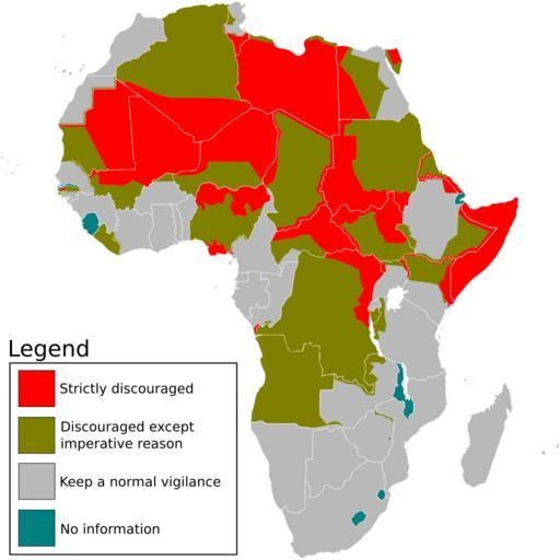 | Keywords: Risks-in-Africa December-25-2012.svg fr Carte des risques en Afrique selon la «diplomatie française» au 25 décembre 2012 Recueil d'informations cartographiques sur les risques en Afrique issues du site gouvernemental français www diplomatie gouv fr/fr/conseils-aux-voyageurs/conseils-par-pays/ en Map of risks in Africa according to the french diplomacy December 25 2012 Collection of cartographic information on the risks in Africa stemming from the french government website www diplomatie gouv fr/fr/conseils-aux-voyageurs/conseils-par-pays/ 2012-12-25 Based on BlankMap-Africa svg by Lokal_Profil Freepius44 CC-zero Travel maps of Africa Maps of Africa Atlas of Africa SVG maps of Africa Uploaded with UploadWizard |