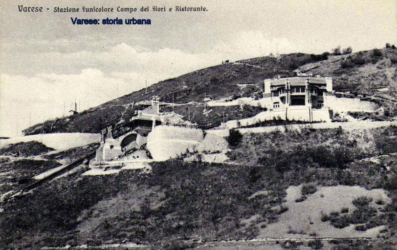 Keywords: Il Ristorante Campo dei Fiori e la stazione a monte della funicolare ancora in costruzione (entrambe opere dell'arch. Giuseppe Sommaruga, 1910), manca ancora il Grand Hotel (terminato solo nel 1912). In alto le tre croci e i versanti della montagna completamente privi di copertura vegetale. varese funicolare campodeifiori |