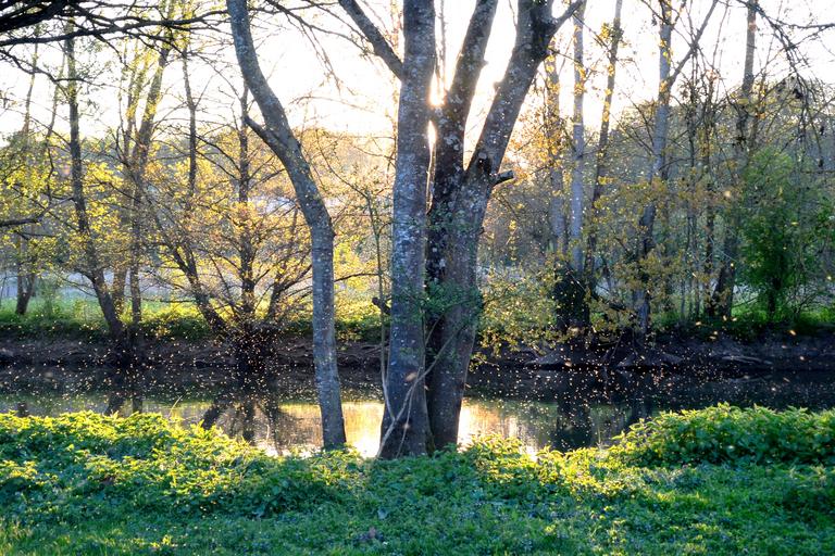 Keywords: river bank sunset bees flies swarm water peace serenity twilight green nature bucolic romantic