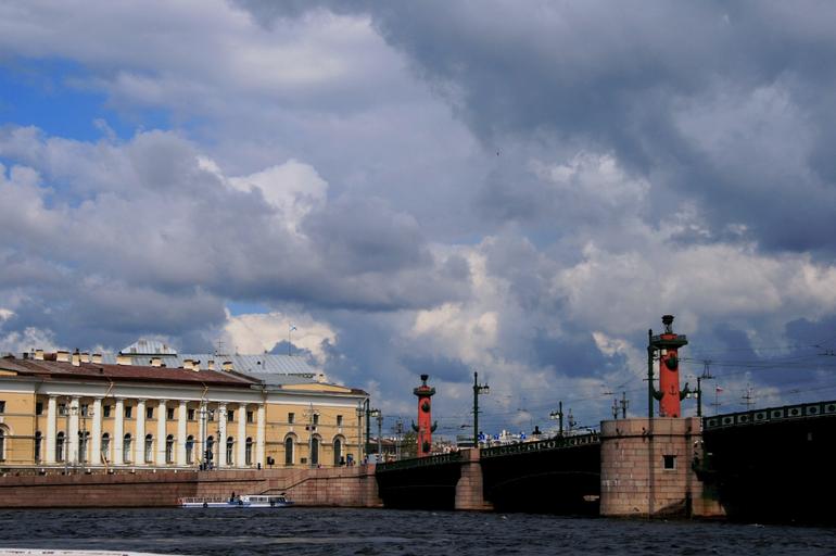 Keywords: river neva buildings rostral columns marine landmarks clouds