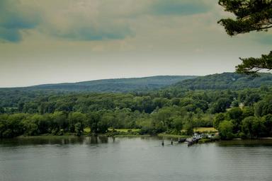Keywords: river outside hills boat ferry dock pier shore creek lake water sky dusk grey landscape outdoors mountain travel nature park attraction landmark green rural