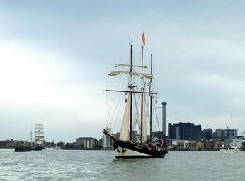 Keywords: river thames ship sail masts city uk tall schooner hull mizzen lanyards ropes nautical seamanship captain crew travel cityscape history historical vintage skyline sky clouds