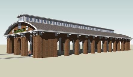 Keywords: RKO backlot Atlanta railway depot from Gone With The Wind.jpg Other views <gallery> Image RKO backlot Atlanta railroad depot from Gone With The Wind - alt angle jpg </gallery> 2D image exported from a 3D model of a variant of a movie set exterior that once existed until 1976 on the now demolished RKO Studios Forty Acres backlot in Culver City California The model depicts the Atlanta railroad depot as it appeared in the 1939 cinema classic <i>Gone with the Wind</i> The set as constructed was a slightly downsized version as is the 3D model of the actual depot and it was featured prominently in scenes that dramatized events leading to the fall of Atlanta in that film The backlot movie set was an incomplete structure with roofing only on the side which was filmed and with a painted facade simulating the windowed structure along the roofline self-made in Google Sketchup 6 0 2008-05 Kipp Teague Film sets RKO Studios Architectural drawings by SketchUp Gone with the Wind film