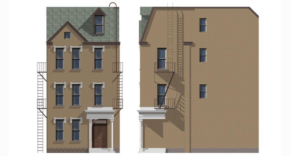| Keywords: RKO backlot - tall hotel elevation.jpg Other views <gallery> Image RKO backlot - tall hotel jpg </gallery> 2D image exported from a 3D model of a building that once existed until 1976 on the now demolished RKO Studios backlot called Forty Acres This particular building the tallest permanent structure on the backlot was constructed as the feature set for the 1947 feature film The Long Night as the Allegheny House It was seen again in the 1949 film noir classic The Set-Up and later appeared regularly on television's The Andy Griffith Show as Mayberry Hotel It also appeared on Star Trek's episode of Miri in which Captain Kirk and crew find the eponymous character and later when Spock and security are pelted with rocks from the fire escape above The same fire escape which is located on the far side of the structure is seen also in The City on the Edge of Forever where Kirk steals clothes for both he and Spock to blend in with 1930s New York Showing elevations of the south and east facades of the building as it once stood the 3D model was constructed in SketchUp 6 0 in 2008 by Bill Wrigley self made designed in Google Sketchup 6 0 2008-03 Bill Wrigley Film sets RKO Studios Architectural drawings by SketchUp Architectural 3D drawings CAAD |