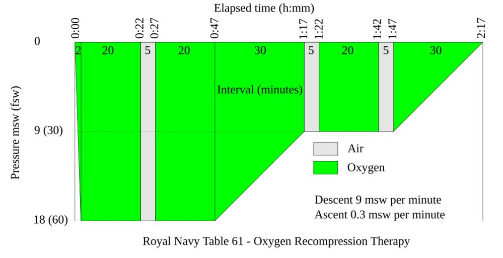 Keywords: RN Table 61.svg en Graphic representation of Royal Navy Table 61 - Oxygen Recompression Therapy 2016-03-30 own Peter Southwood other versions cc-zero Decompression tables