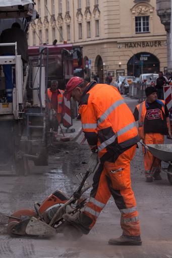Keywords: road construction construction workers teersäge renovation rehabilitation workwear safety clothing helm warning color noise noise pollution dust fine particle pollution orange