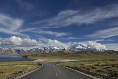 Keywords: road distance winding road travel nature sky landscape blue highway rural way curve country scenery drive horizon view countryside transportation scenic outdoor empty vacation nobody mountains path snow cloud lake water