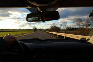 Keywords: road exit drive windshield trip tour more driver rear mirror landscape guard rail delineator posts hand steering wheel control