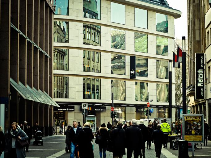 Keywords: road mirroring architecture building facade window city housewife glass glass front human pedestrian zone shopping düsseldorf urban