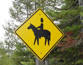 Keywords: road sign horseback riding head hat yellow usa horse