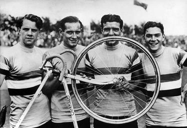 | Keywords: Robert Charpentier, Guy Lapébie, Jean Goujon, Roger-Jean Le Nizerhy.jpg The Racing Cyclists Robert Charpentier Guy Lapebie Jean Goujon And Roger Le Nizerhy Just After Having Won The Team Race At The Olympic Games Of Berlin In August 1936 http //www gettyimages co uk/detail/news-photo/the-racing-cyclists-robert-charpentier-guy-lapebie-jean-news-photo/105220247 Unknown Keystone France 1936 Anonymous-EU Robert Charpentier Guy Lapébie Jean Goujon cyclist Roger-Jean Le Nizerhy | ||||