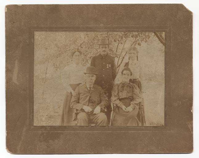 Keywords: smithsonian institution smithsonianinstitution portrait robert f. blum robertfblum family late 19th century late19thcentury group faded outdoors painter sepia family portrait familyportrait generations soldier decorated soldier decoratedsoldier hat braids serious tree archives of american art archivesofamericanart monochrome Description: Portrait of Blum with group, possibly his family. Identification on verso (handwritten): Blum, Robert F; 1857-1903; family? Creator/Photographer: Unidentified photographer Medium: Black and white photographic print Dimensions: 13 cm x 18 cm Date: 1875 Collection: Charles Scribner's Sons Art Reference Department Records, c. 1865-1957 Persistent URL: www.aaa.si.edu/collections/images/detail/robert-f-blum-an... Repository: Archives of American Art Accession number: aaa_charscrs_4221 Description: Portrait of Blum with group, possibly his family. Identification on verso (handwritten): Blum, Robert F; 1857-1903; family? Creator/Photographer: Unidentified photographer Medium: Black and white photographic print Dimensions: 13 cm x 18 cm Date: 1875 Collection: Charles Scribner's Sons Art Reference Department Records, c. 1865-1957 Persistent URL: www.aaa.si.edu/collections/images/detail/robert-f-blum-an... Repository: Archives of American Art Accession number: aaa_charscrs_4221