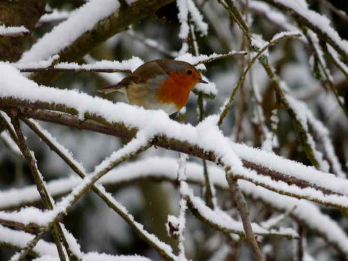 Keywords: robin bird winter snowy snow branch tree birds