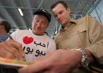 Keywords: Robin Williams USS Enterprise.jpg Caption 031219-N-9742R-003 Arabian Gulf Dec 19 2003 -- Actor/comedian Robin Williams signs an autograph for Lt Matthew Duffy from Chicago Ill during a holiday special aboard USS Enterprise CVN-65 hosted by the United Service Organization USO The show took place in the shipÕs hangar bay and featured the visiting Chairman of the Joint Chiefs of Staff General Richard Myers NASCAR driver Mike Wallace and World Wrestling Entertainment WWE celebrity Kurt Angle Enterprise is currently underway conducting missions in the Arabian Gulf in support of Operation Iraqi Freedom and the continued war on terrorism U S Navy photo by Photographer's Mate Airman Milosz Reterski RELEASED Source http //www news navy mil/view_single asp id 11125 navy mil PD-USGov-Military-Navy Robin Williams