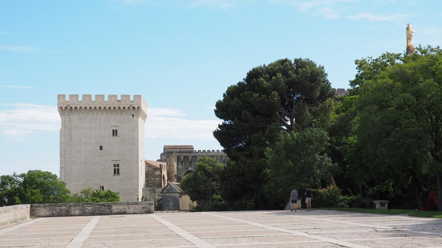 Keywords: rocher of the cathedral garden park tower fortress palais des papes statue statue of the virgin mary virgin mary golden golden statue