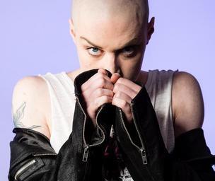 Keywords: rock chick music woman bald rock female performer singer rocker person tattoo attitude performance white face leather jacket hands