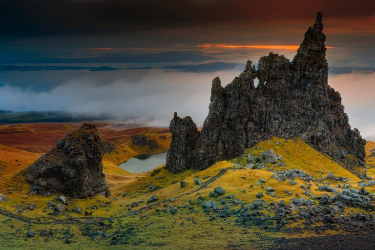 Keywords: rock cliff scotland isle of skye old man of storr clouds sky landscape water nature red clouded sky beautiful mountain hdr golden mood sunrise cloud strips cloud formations dramatic sky travel cloud formation mountains nature paradise