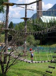 Keywords: rock climbing rope child step bridge green nature sport suspended helmet