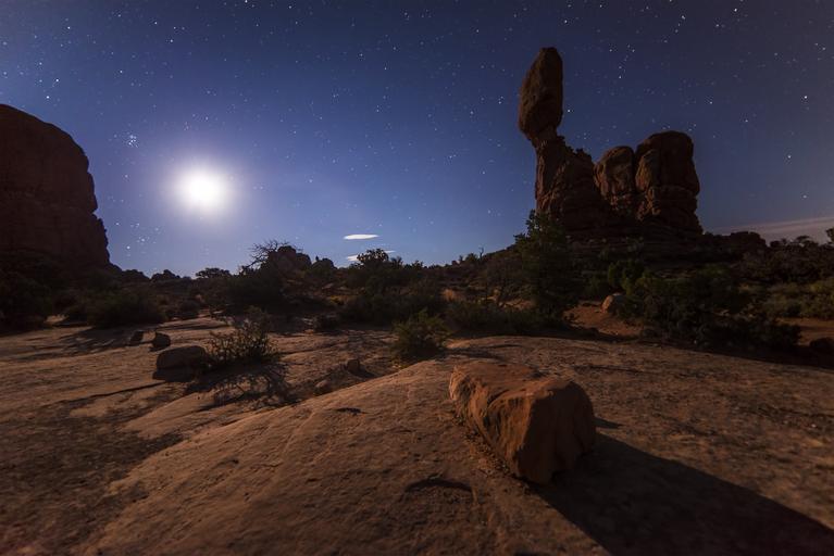 Keywords: rock desert night moonshine full moon moon stars sky universe geology erosion formation sandstone shape balance nature landscape desert landscape stone dry outdoors scenic cosmos