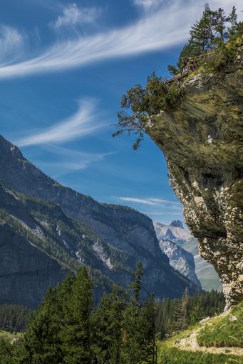 Keywords: rock mountains trail trees hike lake oeschinen switzerland kandersteg summer nature