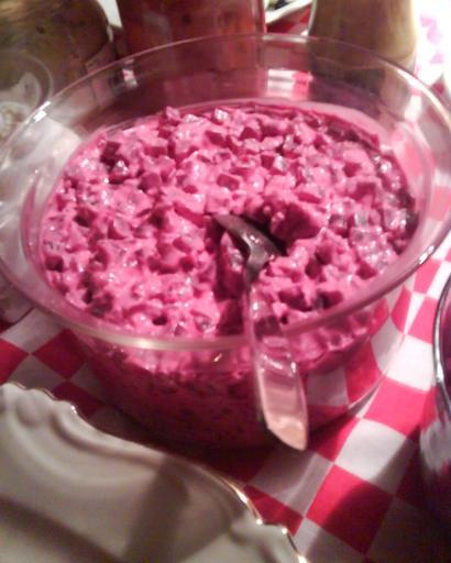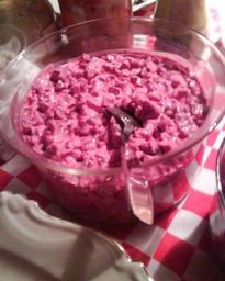 Keywords: Rödbetssallad.jpg en A bowl of beetroot salad sv En skål med rödbetssallad Own Frisko 24th of December 2008 Salads of Sweden Vegetable dishes of Sweden Christmas food Beetroot-based food Pink food Salads