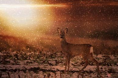 Keywords: roe deer wild red deer field meadow nature damm wild sunset snow snowflakes lighting